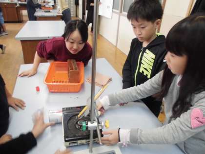 水も金属と同じように温めたところから温まっていくのだろうか。予想を立てた後,実験をしました。サーモテープを水に沈めて実験を開始してみると,意に反して上から温まっていく様子に驚いていました。その後,ビーカーにけずりぶしを入れて,水が対流する様子を観察しました。