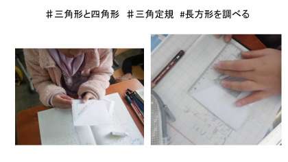 算数「三角形と四角形」では,三角定規の直角が活躍しています。今日は,長方形のかどの形や辺の長さを調べました。長方形はすべてのかどが直角であること,辺の長さは向かい合った2つの辺が同じ長さであることを知りました。