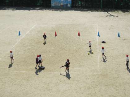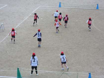 3月4日(金)3年生は体育の学習で「ラインサッカー」をしています。みんな楽しそうにボールをけったりパスをしたりしています。