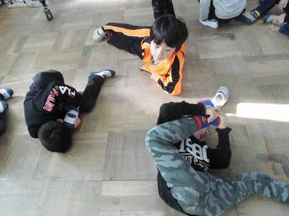 1年生は,1月に行われる福西タイムに向けて,話合いや練習を始めています。写真は寝転んで休憩……ではありません!動物のようすを思い出したり,ビデオを見たりしながら,一生懸命ジェスチャーをする子どもたちのようすです。