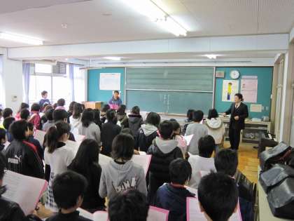 5年生はこの日,卒業証書授与式や6年生を送る会で歌う「桜の栞」を学年合同で練習しました。「歌うときには,少し目線を上にして歌おう」などのアドバイスを受けながら真剣に練習していました。