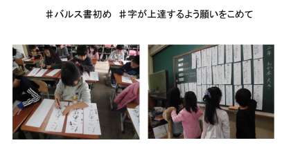今日は,「字体が…とめはねが…」ではなく書初めの由来を簡単に伝え,書初めの由来にあるような「1年間の字の上達を願う」というめあてをもって取り組みました。