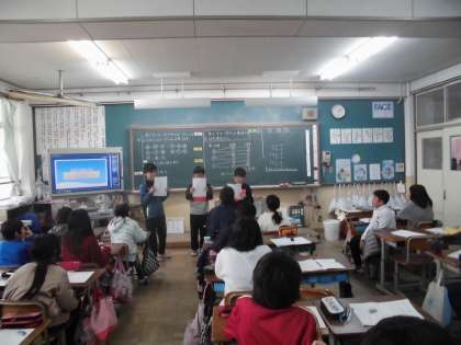 算数では,友達に対して,具体物カードを使って説明するチームが現れてくれました。ジェントルです。