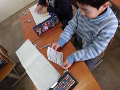 自力解決の時間には,葉っぱの絵の中に分かりやすく印を書き込みながら,100が10のいくつ分かということを確かめていきました。