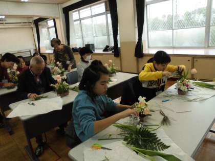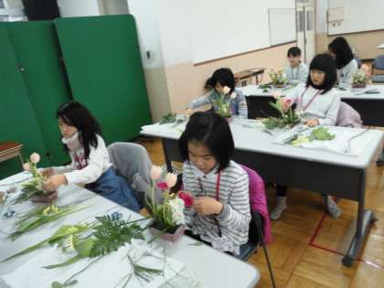 今回は華道教室として行いました。色とりどりの様々な花材を使っての作品づくりを,子どもたちは楽しんでいました。個性豊かな美しい作品ができあがり,満足感いっぱいの表情も見られました。(校長先生の作品はどれかな?)