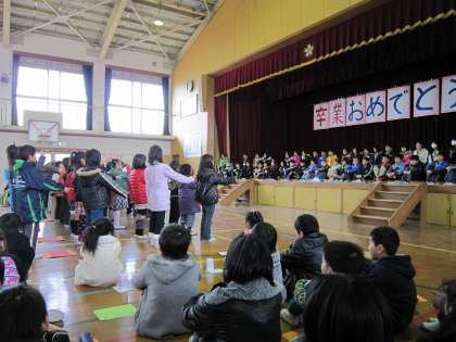 2年生は,集団登校での思い出を話した後,「世界が一つになるまで」を振り付けをつけて歌いました。聞いている6年生は話を聞きながら思い出しているようでした。