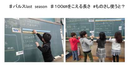 先日の「100センチメートルをこえる長さ」の学習の様子です。「120センチメートルの他の表し方はあるのかな」という課題をスタートに,ものさしを使って,別の表し方を考えたり,いろいろなものをはかったりしました。とても楽しそうでした。