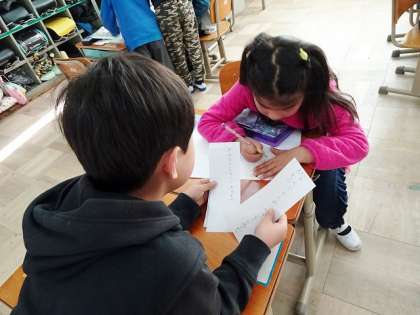 と,顔を寄せ合って相談します。3つのヒントで,みんながちょうど分かるくらいの楽しいクイズ作り。発表が楽しみです。