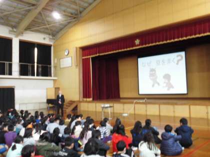 立春を過ぎ一日一日春へと移り変わる季節。子どもたちは一歩一歩新学・進級に向けて歩んでいます。先日の朝会では節分のお話から「豆(まめ)をまくことは『魔(ま)を滅(め)っする』ことです。心の中にある鬼〈弱点〉を退治〈克服〉し,よりよく生きていきましょう。」と全校児童へ伝えました。