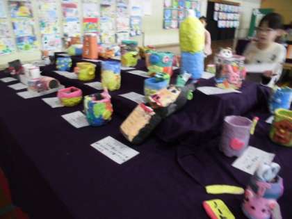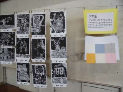 版画や工作の作品が見事です。身近にある材料から色や形にChangeしている作品にはおもしろいところがいっぱいです。版画でもちょっとした材料を使うだけで表現が豊かになる。すばらしいです。