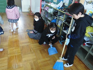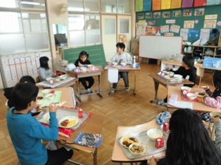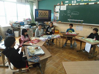 今日の給食時間と掃除時間はいつもと少し違いました。4年生の6人の友達がきてくれました。交流の学習の時は,交流の教室で学習します。しかし,今日はなんだか,反対で「自分たちの教室へ来てくれた。」と嬉しそうに話していました。最初はドキドキしていましたが,4年生の友達がクイズやなぞなぞ問題を出してくれて緊張がとけました。掃除の時間も一緒にしてくれたり,手伝ってくれたりしてもらってさらにピカピカの教室になりました。ありがとう♪