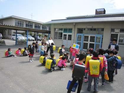 帰りは,近くの子ども達がそろっての集団下校です。自分のグループの色ごとに並んで帰りました。