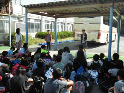 青空広がる気持ちの良い朝。福西校の6年生35人が元気に出発しました。あいさつ主任による出発の言葉は,修学旅行をみんなで楽しみたいという思いが込められていました。みんなですてきな思い出をつくりましょう!
