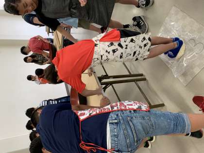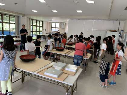 ウェルネスパーク五色「夢工房」にてうどんを作っています。昼食となるうどんでもあるのでみんな一生懸命です。