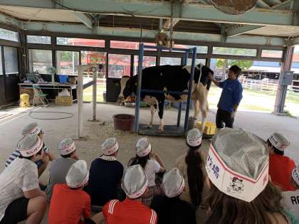 牛の名前はラッキーです。牛の大きさに驚きながらの乳しぼり体験。みんなですてきなぼうしをかぶって行いました。