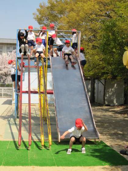2年生は,体育で遊具の使い方の学習をしました。2年生から総合遊具の1番上まで上ってもよいことになります。この日は1番上に上って遊具を楽しみました。滑り台の下には真新しい人工芝がひかれ,より安全に楽しめるようになっています。