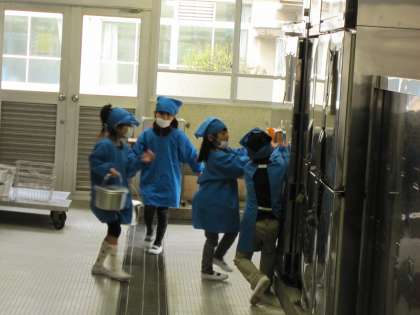 給食の時間になると,当番の子ども達は青色のエプロンと三角巾,お家から持ってきたマスクを身につけてクラスごとに給食室に向かいます。そして,手をきれいに洗い,用意されたおかず等を教室へと運びます。