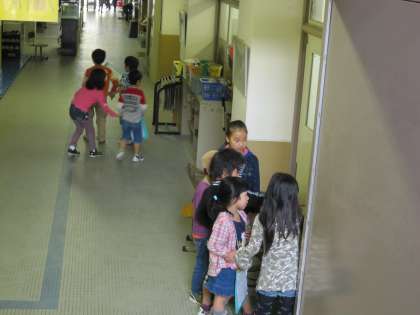 2年生は,1年生に学校の中を紹介しようと,いろいろな教室へ行って説明を考えていました。この日は本番です。1年生の手をとり,校内を歩きます。それぞれの教室の前では,考えていた説明をゆっくりと話しました。歩くときには,1年生の速さに合わせて歩いていました。