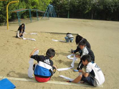 今日の委員会活動で,保健・体育委員は,アルボース液の点検をしたり,新しく購入したサッカーゴールに使う砂袋の用意をしたりしていました。