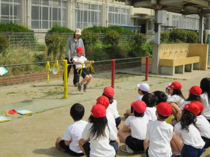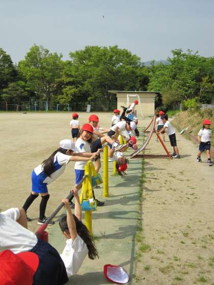 2年生は,体育で「てつぼう」の学習をしています。学習の中で,自分のできる技をより上手にできるように練習した後,新しい技にチャレンジする練習に取り組んでいます。