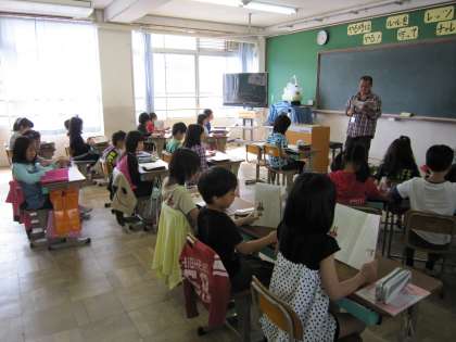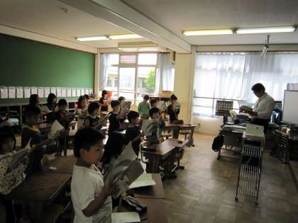3年生は,今国語で「きつつきの商売」を学習しています。この日は学習の始めに音読に取り組んでいます。「背筋を伸ばして」「はっきりとした声で」と音読の仕方を確かめながら読んでいました。