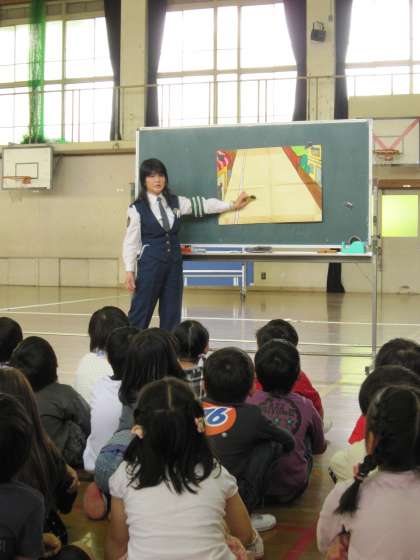 これを聞いて子ども達は「どうして?」と聞くと,「線の引かれていない道路では,車や自転車・バイクからよく見えるように道路の右端を歩くんですよ。」と説明してもらい,なるほどという顔をしていました。