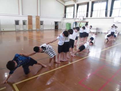 組体操では,5年生の仲間と協力しながら技の完成に向けて練習を重ねていました。