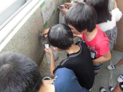 算数科の授業で「水のかさ」を学習している2年生。今日は,袋を使って1Lを量りました。子どもたちは,1Lピッタリになるようにグループで協力することができました。