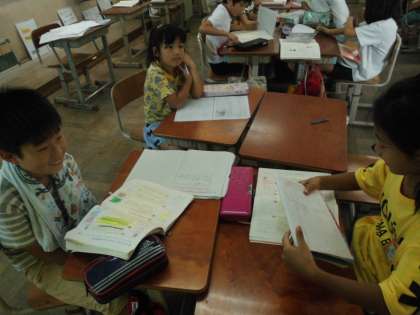 国語では1年生に学校生活を伝えようとグループ学習をしています。