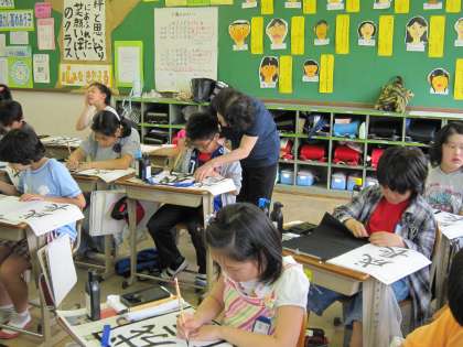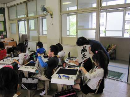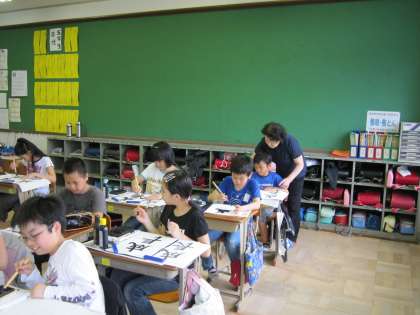 5月10日(火) 5年生は今年度初めて,書写学習をしました。3〜6年生の書写の時間には,地域の学校支援ボランティアの方に来ていただいています。この日も,ボランティアの方に筆の使い方をアドバイスしてもらいながら練習に取り組みました。