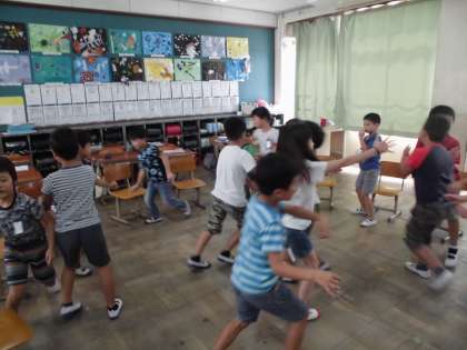 真ん中に立つ友だちの声を大切に聞き,動きます。フェイントをかける子もいましたが,さすが友だちの声を大切にする2年生。全く引っかからずに最後までやり遂げることができました!