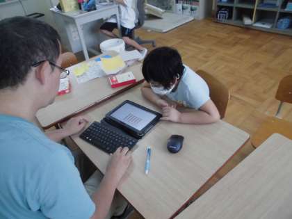 今日はかけ算の九九を覚えるプログラミングを使って練習をしました。2のだん,3のだんまでは数えながらとけていました。4のだんのときに,かける数が1ふえると,4ずつふやすと答えが見つかることに気付くと,答えられるスピードもはやくなっていきました。