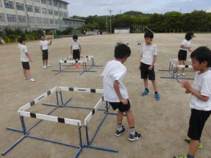 今日の陸上練習は,5年生チーム。テーマは「瞬発力」と「ピッチ」。ハードルトレーニングで汗を流しました。