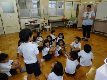 養護の先生からお話があった後、身体計測をしました。どの子ども達も、どんどん成長していっています。