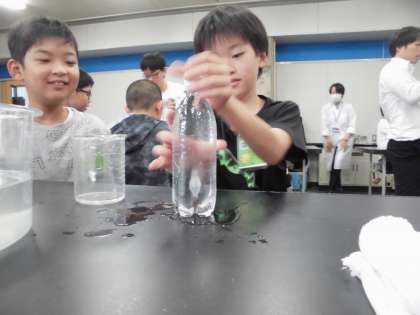 実験学習は「浮沈子(ういたりしずんだりするおもちゃ)」を作りました。自分で作ったものが思い通りに動くと喜んでいました。