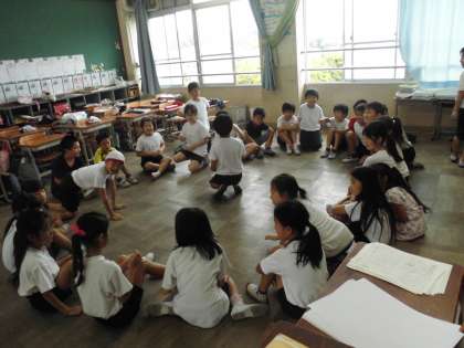 雨のため体育館で運動会種目「台風の目」の説明をしました。
