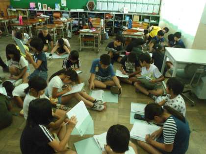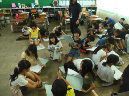 4年生の総合学習で福祉について考える学習をしています。各グループにわかれて,調べる内容を話し合っています。