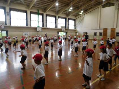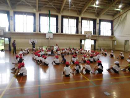2年生との合同団体演技で、隊形移動の練習を何回も練習しました。雨天の為、体育館での練習となりましたが、子ども達はとても頑張っていました。