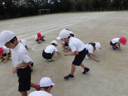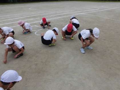 団体演技の練習をしている2年生。休憩時間に少し時間があったので100メートルトラックの中にある小石拾いを数人に頼んだところ,いつの間にか2年生全員が手伝ってくれました。さらに1年生の子どもたちも手伝ってくれるという素晴らしい光景が・・・!!