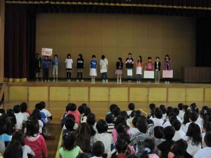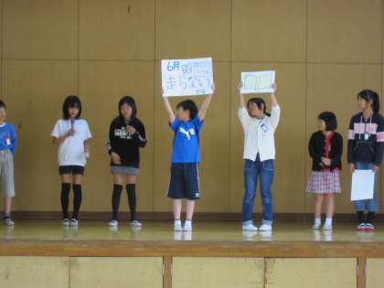 今年度初めの児童集会を行いました。この日は,代表委員会からでした。代表委員会では,今年度から月ごとのめあてを決め,全校児童で意識して取り組んでいくことにしました。
