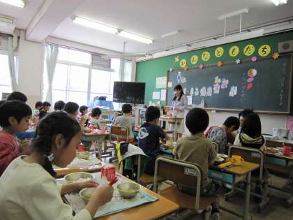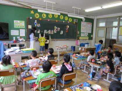 この日は,1年1組でした。1年生には「給食について」というテーマで指導がされました。子ども達はお話を聞いた後,給食の用意をして給食を食べます。