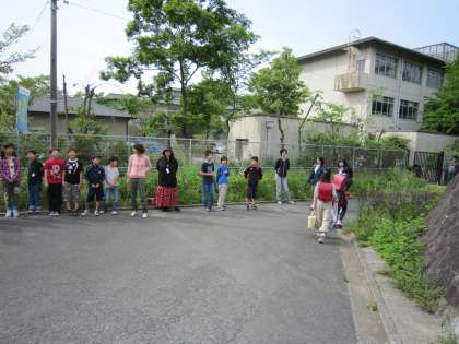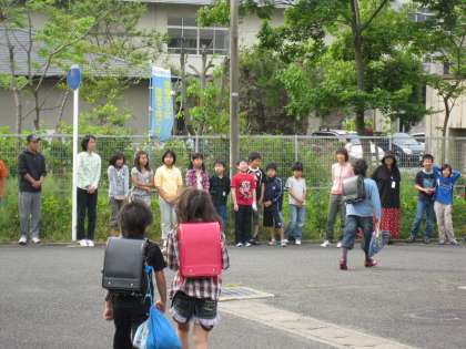 児童会の子ども達が,集団登校で来る子ども達に「おはようございます」と声をかけています。