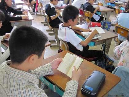 朝の時間に,「おはよう読書」として全校一斉に読書を楽しんでいます。子ども達は自分の読みたい本を机の中に入れています。そして,「おはよう読書」の時間になると取り出して読んでいます。この写真は5年2組の様子です。みんな本の世界に入りこんでいました。