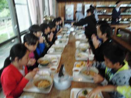 山の家での初めての食事です。チキンライスかきつねうどんを選んで,自分たちのテーブルに座ります。進んでお茶の用意をしてくれる姿もありました。副食はバイキングで選びます。野菜もたっぷりとお皿に乗せています。栄養のバランスもばっちりです。