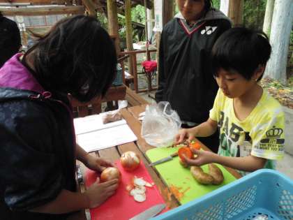 これから野外炊事を始めます。まず山の家の先生から説明を聞きました。グループで役割も決めています。みんな手際よく作業を進めています。さあ,上手にハヤシライスができるかな?