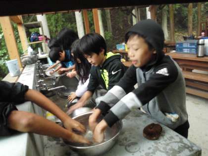 おいしくいただいた後は,使った食器やお鍋をきれいに洗います。お鍋のすすがなかなか落ちません。けれども一生懸命洗っています。手が冷たいだろうと山の家の先生がお湯を沸かしてくださいました。時間をかけてたわしでごしごしとこすり,冷えた手をお湯で温めます。仲間で協力して最後まで取り組みました。山の家の先生からもたくさんほめてもらいましたよ。素晴らしい!!