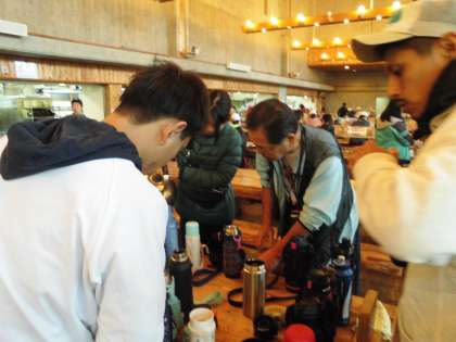 みんながおいしく朝食をいただいている間に,学生ボランティアさんを中心に,お茶沸かし水筒に入れてもらっています。あれれ?よく見ると奥村先生もお手伝いをしてくださっていますよ。みんなの活動にはたくさんの方々のサポートがあるのですね。感謝の気持ちを忘れずに,今日も1日頑張ります!