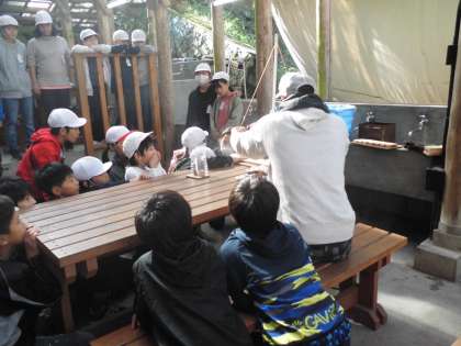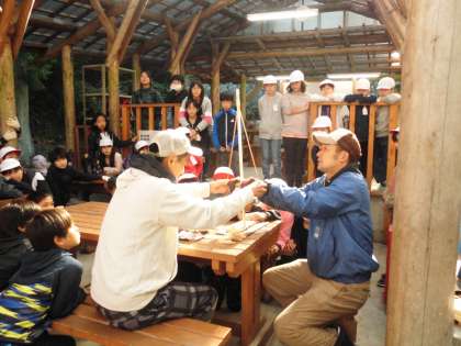 午前中の活動は火おこしから始まります。山の家の先生から道具の使い方を教えてもらいました。煙が上がるとみんなから大きな歓声が!さあ,次はみんなの番です。