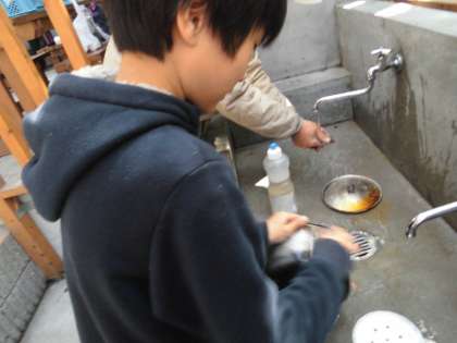 おいしくいただいた後は,後片付けです。こちらも昨日と比べてとても手際よく進めることができています。ゴシゴシ鍋をこすっています。すすと格闘中!