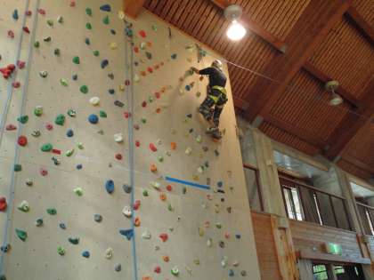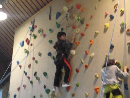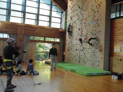 さあ,いよいよ高い壁に挑戦です。最初に先生のお手本も見せてもらいました。次はみんながチャレンジします。こちらの高い壁は,先生と登る人がロープでつながっています。先生を信じて思い切って上を目指すのです。